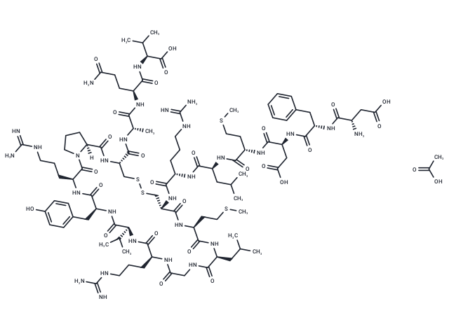 | Smiles | O=C1N2[C@](CCC2)(05)C(N[C@@H](CSSC[C@@H](C(N[C@H](C(N[C@H](C(NCC(N[C@H](C(N[C@H](C(N[C@H](C(N[C@H]1CCCNC(N)=N)=O)CC3=CC=C(C=C3)O)=O)C(C)C)=O)CCCNC(N)=N)=O)=O)CC(C)C)=O)CCSC)=O)NC([C@H](CCCNC(N)=N)NC([C@H](CC(C)C)NC([C@H](CCSC)NC([C@H](CC(O)=O)NC([C@@H](NC([C@@H](N)CC(O)=O)=O)CC4=CC=CC=C4)=O)=O)=O)=O)=O)C(N[C@@H](C)C(N[C@@H](CCC(N)=O)C(N[C@H](C(O)=O)C(C)C)=O)=O)=O)=O.CC(O)=O |
