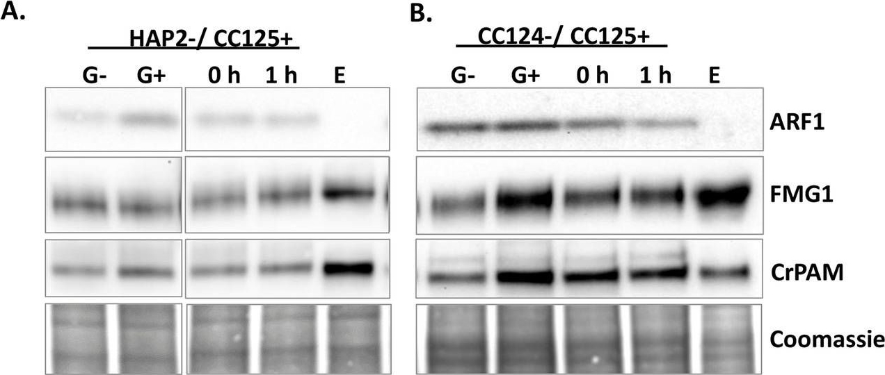 Release of CrPAM in ciliary ectosomes is developmentally regulated.A. HAP2 minus and CC125 plus gametes, mating cells (0- or 1-hour), and ectosome-rich pellets prepared from the 1-hour media were analyzed. Equal amounts of protein (30 ?g) were fractionated and subjected to immunoblot analysis for ARF1, FMG1, and CrPAM. Quantification of FMG1 and CrPAM protein levels is shown in the lower panels; results are the average of two independent experiments—error bars indicate the range. B. Cell lysates and ectosomes prepared from wild-type CC124?/CC125+ gametes were analyzed as described for panel A. Results are the average of six independent experiments; error bars indicate ± SEM. Asterisks indicate a statistically significant difference between two groups (*P < 0.01). C. and D. Immunoblot analysis of cells and ectosomes harvested from vegetative CC124? (C) and CC125+ (D) cells; quantification of FMG1 and CrPAM levels is shown below. Results are the average of three experiments; error bars indicate ± SEM. CrPAM and FMG1 levels in vegetative ectosomes differed significantly from levels in cells (**P = 0.0065, ***P < 0.0001). E. CrPHM and CrPAL activities were assayed in cells and ectosomes released by vegetative CC124? and CC125+ cells, mating HAP2?/CC125+ cells, and mating CC124?/CC125+ cells. Both activities were significantly higher in ectosomes released by mating gametes (*P < 0.01, **P < 0.001, ***P < 0.0001; one-way ANOVAs). F. Immunogold-electron microscopy negative stain image showing localization of CrPAM on mating ectosomes with antibody against CrPAM luminal domain. Negative control, ectosomes incubated with gold-tagged secondary antibody alone. The underlying numeric data for this figure can be found in S1 Data. ARF1, ADP ribosylation factor 1; FMG1, flagellar membrane glycoprotein 1.