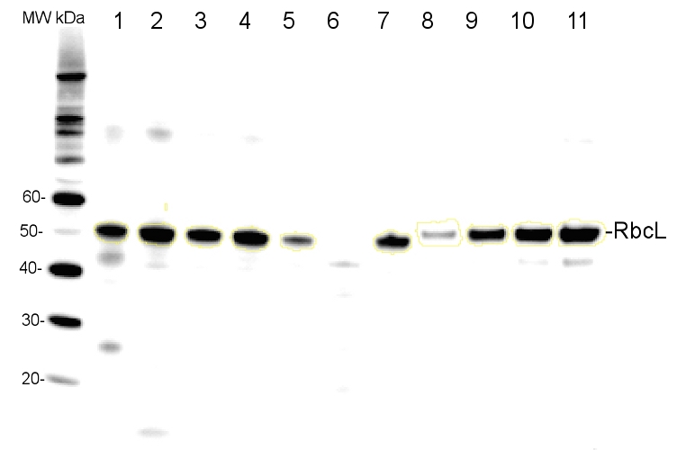 2 µg of total protein from (1-7) Prochlorococcus sp. extracted with Protein Extration Buffer, PEB (AS08 300), (8-11) Rubisco protein standard (AS01 017S) were separated on 4-12% NuPage (Invitrogen) LDS-PAGE and blotted 1h to PVDF. Blots were blocked immediately following transfer for 1h/RT with agitation. Blots were incubated in the primary antibody at a dilution of 1: 20 000 for 1h at room temperature with agitation. The antibody solution was decanted and the blot was rinsed briefly twice, then washed once for 15 min and 3 times for 5 min in TBS-T at room temperature with agitation. Blots were incubated in secondary antibody (anti-rabbit IgG horse radish peroxidase conjugated) diluted to 1:50 000 for 1h/RT with agitation. The blots were washed as above and developed for 5 min with ECL detection reagent according the manufacturers instructions. Images of the blots were obtained using a CCD imager (FluorSMax, Bio-Rad) and Quantity One software (Bio-Rad). There is a low level of a known RbcL cleavage product below the main band in some of the Prochlorococcus samples.