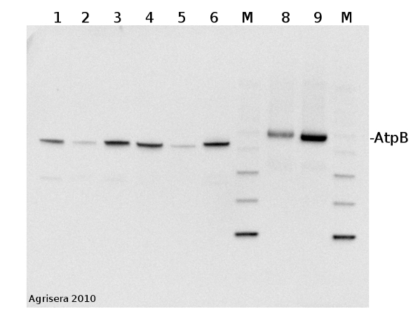 | Additional information (application): | Blue Native gel electrophoresis (BN-PAGE) has been performed on samples solubilized with digitonin (4:1) and loaded at 100 µg/well. Gel thickness was 2 mm with 4.5-16 % gradient. Antibody is recognizing mitochondrial form of AtpB Subota el. al (2011). This antibody can be used as a loading control for bacteria, Bacillus cereus. |