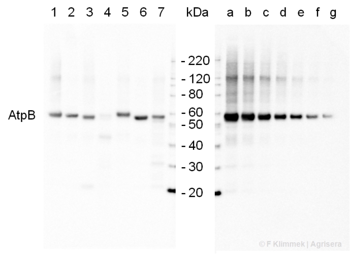 Used as loading controlMichele Grieco | 2014-06-16For all these antibodies I loaded an amount of sample with a chlorophyll concentration of only 0,5 µl/ml, and in western blotting analyses the ECL signal was very intense. Moreover, I did not get aspecific bands for any of these antibodies.Andre Nordhues/Marita Hermann | 2012-11-2750 µg of total protein from Chlamydomonas reinhardtii was separated on 13 % SDS Gel and blotted 1h to PVDF.Blots were incubated in the primary antibody at a dilution of 1: 6 000 for 1h at room temperature with agitation.The primary antibody can be reused several times. Three bands are detected: 70 kDa (chloroplastic CF1 Atp Synthase), ~90 kDa, and ~120 kDa.
