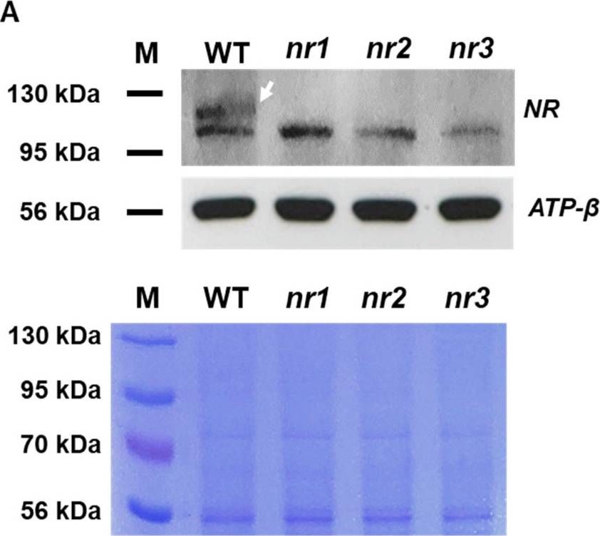 | Background: | Assimilatory nitrate reductase (NR), (EC.1.6.6.1) catalyses the reduction of nitrate to nitrite in the cytoplasm. Plants contain 2 forms of NR: NADH-NR (most common form in plants and algae, predominantly found in green tissues) and NAD(P)H-NR (uses NADH or NADPH as the electron donor, constitutively expressed in plants at a low level). NADH-NR is a homodimer of two identical subunits (100-115 kDa each, hold together by a Mo-cofactor) each of them coded by up to three genes (NR1-3, NIA1-NIA3). |