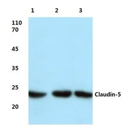Western blot (WB) analysis of Claudin-5 pAb at 1:500 dilution Lane1:Hela cell lysate treated with LPS Lane2:Mouse liver tissue lysate Lane3:Rat lung tissue lysate