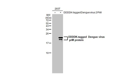 Non-transfected (–) and transfected (+) 293T whole cell extracts (30 μg) were separated by 15% SDS-PAGE, and the membrane was blotted with Dengue virus prM protein antibody (GTX134828) diluted at 1:5000. The HRP-conjugated anti-rabbit IgG antibody (GTX213110-01) was used to detect the primary antibody.