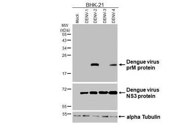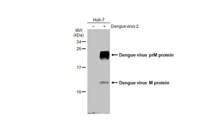 Non-infected and infected BHK-21 whole cell extracts (10 μg) were separated by 15% SDS-PAGE, and the membrane was blotted with Dengue virus prM protein antibody (GTX134828) diluted at 1:5000. The HRP-conjugated anti-rabbit IgG antibody (GTX213110-01) was used to detect the primary antibody.