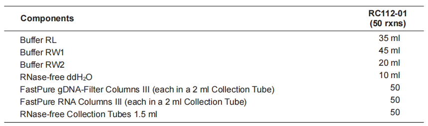 The FastPure Cell/Tissue Total RNA Isolation Kit V2 provides a rapid method for extracting total RNA from animal tissues and cells. The kit is based on silica gel membrane purification technology and does not require β-mercaptoethanol, phenol/chloroform, or any other toxic reagent during the extraction process. It takes only 6 min to extract high-quality RNA. The kit contains FastPure gDNA-Filter Columns III which can effectively remove impurities and gDNA. FastPure RNA Columns III can efficiently bind RNA with an optimized buffer to obtain high-purity total RNA. The isolated RNA has little gDNA residues and no proteins or other impurities contamination. It can be used for RT-PCR, Real-Time PCR, Microarrarys and other downstream experiments.