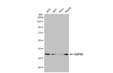 Various whole cell extracts (30 μg) were separated by 10% SDS-PAGE, and the membrane was blotted with GAPDH antibody [GT239] (HRP) (GTX627408-01) diluted at 1:10000. The HRP-conjugated anti-rabbit IgG antibody (GTX213110-01) was used to detect the primary antibody.