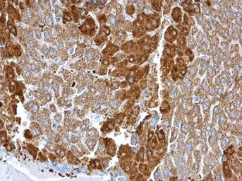Glutamine synthetase antibody [GT1055] detects Glutamine synthetase protein at cytosol on human hepatoma by immunohistochemical analysis.