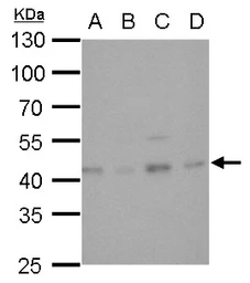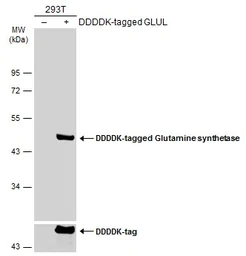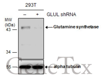 Non-transfected (–) and transfected (+) 293T whole cell extracts (30 μg) were separated by 10% SDS-PAGE, and the membrane was blotted with Glutamine synthetase antibody [GT1055] (GTX630654) diluted at 1:1000. The HRP-conjugated anti-mouse IgG antibody (GTX213111-01) was used to detect the primary antibody.