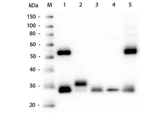 WB analysis of various samples using GTX26708 Goat Anti-Mouse IgG antibody. Lane 1 : Mouse IgG Lane 2 : Mouse IgG Fc fragment Lane 3 : Mouse IgG Fab fragment Lane 4 : Mouse kappa Lane 5 : Mouse serum Loading : 50 ng Dilution : 1:1000