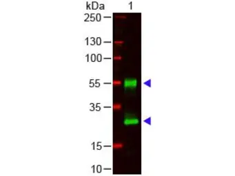 Western Blot of GTX26708 Sample: Mouse IgG. Load: 100 ng per lane. Primary Antibody: GTX26708 1:1000 overnight at 4ºC. Secondary antibody: DyLight™ 800 goat secondary antibody at 1:20,000 for 30 min at RT. Predicted/Obsevered Size: 28 and 55 kDa for Mouse IgG.