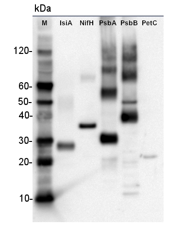 500 femtomoles of His-tagged proteins IsiA, NifH, PsbA, PsbB and PetC were loaded per gel well in Agrisera PEB extraction buffer.  Proteins were separated on  4-12 % NuPAGE PAGE Bis-Tris polycacrylamide gel (Invitrogen) and blotted 1h to PVDF. Blots were blocked with   for 1h at room temperature (RT) with agitation. Blot was incubated in the primary antibody at a dilution of 1: 1 000 for 1h at RT with agitation. The antibody solution was decanted and the blot was rinsed briefly twice, then washed once for 15 min and 3 times for 5 min in TBS-T at RT with agitation. Blot was incubated in secondary antibody (goat, anti-mouse IgG horse radish peroxidase conjugated, from Agrisera AS11 1772) diluted to 1:25 000 in 2 % ECL Advance blocking reagent for 1h at RT with agitation. The blot was washed as above and developed for 5 min with ECL according to the manufacturers instructions. Exposure time was  5 seconds.