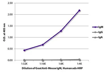 Goat anti-Mouse IgM (mu chain) antibody, pre-adsorbed (HRP) Cat. No. GTX03389-01 Cat. No. GTX03389-01 GTX03389-01 ELISA Image ELISA analysis of purified mouse IgM, IgG, IgA, and human IgM, IgG, IgA using serially diluted GTX03389-01 Goat anti-Mouse IgM (mu chain) antibody, pre-adsorbed (HRP). See all Mouse IgM products
