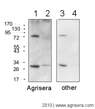 | Additional information: | Concentration: 1.0 mg/ml. Antibody is provided in: 10 mM Sodium Phosphate, 0.15 M Sodium Chloride, pH 7.2, 1% BSA (w/v), Protease IgG free, 0.1% (v/v) ProClin 150. Affinity purified antibody is >95% pure, according to SDS-PAGE. This antibody can used on a very wide range of samples from various species including many model plants, algae, diatoms and bacteria. |