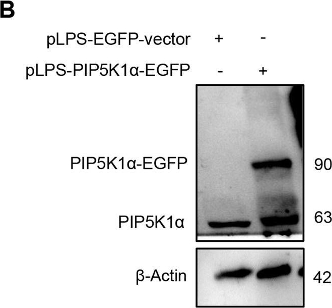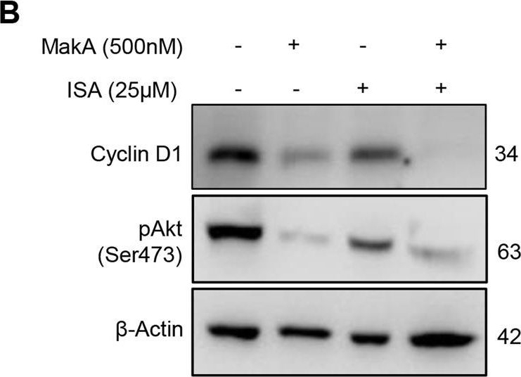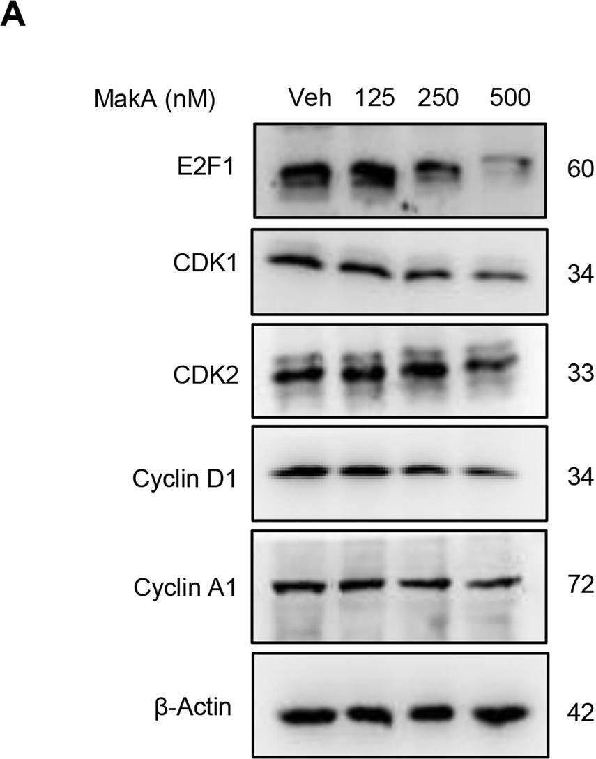| Application examples: | Reactant: Homo sapiens (Human) Application: Western Blotting Pudmed ID: 36473840 Journal: Cell Death Dis Figure Number: 5B Published Date: 2022-12-06 First Author: Toh, E. Impact Factor: 5.638 Open PublicationMakA inhibits tumour cell proliferation in a PIP5K1α-dependent manner.A MakA and PIP5K1α inhibitor, ISA-2011B synergistically inhibited HCT8 cell proliferation as quantified by colony forming assay. Data are representative of two independent experiments; bar graphs show mean ± s.d. Significance from replicates was determined using a one-way analysis of variance (ANOVA) with Dunnett’s multiple comparisons test (post-test) against vehicle (Veh). *p ≤ 0.05 and **p ≤ 0.01. B Western blot analyses of cyclin D1 and pAkt levels in HCT8 cells upon 48 h treatment with MakA (500 nM), ISA-2011B (25 μM) or a combination of MakA (500 nM) and ISA-2011B (25 μM). β-actin was used as a loading control. C Histograms showing the normalized quantification of cyclin D1 and pAkt relative to total actin. Data are representative of at least two independent experiments; bar graphs show mean ± s.d. Significance from replicates was determined using a one-way analysis of variance (ANOVA) with Dunnett’s multiple comparisons test (post-test) against vehicle (Veh). *p ≤ 0.05 and **p ≤ 0.01. D Confocal microscopy analysis of vehicle (Veh), MakA (500 nM), ISA-2011B (25 μM), or a combination of MakA (500 nM) and ISA-2011B (25 μM) treated HCT8 cells (48 h treatment). Cells were stained with cell proliferation marker, Ki67 (green). Nuclei were counterstained with DAPI (blue). Inhibition of HCT8 cell proliferation was quantified by an increase in the number of Ki67-negative stained cells from four individual microscopy fields of view (65-165 cells per field of view). *p ≤ 0.05 and **p ≤ 0.01. Scale bar = 20 μm. Reactant: Homo sapiens (Human) Application: Western Blotting Pudmed ID: 36473840 Journal: Cell Death Dis Figure Number: 6B Published Date: 2022-12-06 First Author: Toh, E. Impact Factor: 5.638 Open PublicationEffect of MakA in HCT8 cells with PIP5K1α overexpression and schematic summaries of the MakA effects on PIP5K1α-mediated signalling.A HCT8 cells were transfected with EGFP-vector control (upper panel) or PIP5K1α-EGFP (lower panel) plasmids as described in “Materials and methods”. For co-localization experiments of MakA and PIP5K1α, the transfected HCT8 cells were subsequently treated with Alexa568MakA (250 nM, red) for 48 h. Nuclei were counterstained with DAPI (blue). Graphs on the right show fluorescence intensity profiles of the corresponding images along the dotted white lines. Pearson correlation co-efficient was used for calculation of Alexa568MakA (red) co-localization with EGFP or PIP5K1α-EGFP (green) along the cell membrane. Scale bars = 10 μm. B Western blot analysis of PIP5K1α levels in EGFP-vector control or PIP5K1α-EGFP HCT8 total cell lysates. C Confocal microscopy analysis of vehicle (Veh) or MakA (250 nM) treated (48 h treatment) HCT8 cells transfected with EGFP-vector control or PIP5K1α-EGFP plasmids. Cells were stained with cell proliferation marker, Ki67 (green). Nuclei were counterstained with DAPI (blue). Effects on HCT8 cell proliferation was assessed by quantifying the number of Ki67-negative cells from eleven individual microscopy fields of view (65–200 cells per field of view). Significance was determined using an unpaired t test, ns non-significant. D Schematic representations showing (i) the downstream signalling of PIP5K1α during tumour cell proliferation and survival, (ii) the effect of MakA and ISA-2011B inhibition. Reactant: Homo sapiens (Human) Application: Western Blotting Pudmed ID: 36473840 Journal: Cell Death Dis Figure Number: 4A Published Date: 2022-12-06 First Author: Toh, E. Impact Factor: 5.638 Open PublicationMakA induces G2/M cell cycle arrest in HCT8 cells and alters the expression of cell cycle regulatory proteins.A Western blot analysis shows levels of E2F1, CDK1, CDK2, cyclin D1, and cyclin A in HCT8 cells treated with increasing concentrations of MakA (24 h). B, C Histograms indicate the normalized quantification of E2F1, CDK1, CDK2, cyclin D1, and cyclin A1 relative to total actin. Data is representative of at least two independent experiments and is expressed compared to cells treated with vehicle (20 mM Tris-HCl); bar graphs show mean ± s.d. Significance was determined using a one-way analysis of variance (ANOVA) followed by Dunnett’s post-test in comparison to the vehicle control *p ≤ 0.05 and **p ≤ 0.01. D Cell cycle distribution flow cytometric analysis of HCT8 cells treated with MakA protein (500 nM, 24 h). E Histogram showing the distribution of HCT8 cells during each phase of the cell cycle after treatment with vehicle or MakA. Data are representative of three independent experiments. *p ≤ 0.05 and **p ≤ 0.01. |