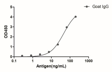 A titer ELISA of Goat IgG. The plate was coated with different amounts of Goat IgG. Goat VHH IgG Fc Gamma recombinant monoclonal antibody (Cat # RAB07252) was used as the primary antibody at 1:5000 and His tag VHH Rabbit IgG Fc fusion recombinant monoclonal antibody (HRP) (Cat # RAB07316) as the secondary antibody.Western Blot