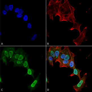 Immunocytochemical staining of SK-N-BE with Grm1/Grm5 monoclonal antibody, clone S75-33 (PerCP) (Cat # MAB18308). (A) DAPI (blue) nuclear stain (B) Phalloidin Texas Red F-Actin stain (C) Grm1/Grm5 Antibody and (D) Composite.Immunoprecipitation