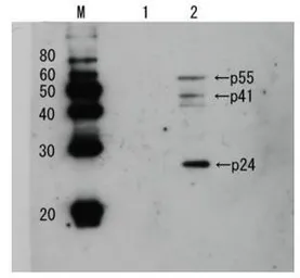 Detection of HIV-1 p24 and precursor proteins p55 and p41 by Western blotting using the anti p24 antibody (unconjugated)). Lane 1: Extract of MT4 cells Lane2: Extract of MT4 cells infected with HIV-1(LAI strain). Various precursors of p24 are also detected. The antiserum was diluted 2,500 fold before use