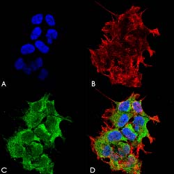 Immunofluorescence staining of SK-N-BE. (A) DAPI (blue) nuclear stain. (B) Phalloidin Texas Red F-Actin stain. (C) GRP170 Antibody. (D) Composite.Immunocytochemistry
