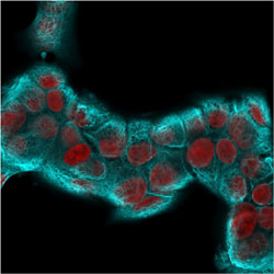 Immunofluorescent staining of MCF-7 cells followed by goat anti-rabbit IgG conjugated to CF488 (Cyan). The nuclear counterstain is Reddot (Red).Flow Cytometry
