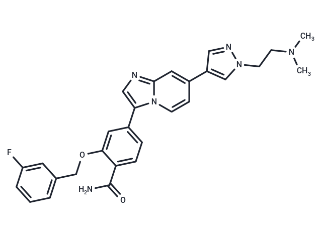 | Smiles | CN(C)CCn1cc(cn1)-c1ccn2c(cnc2c1)-c1ccc(C(N)=O)c(OCc2cccc(F)c2)c1 |
