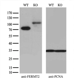 WB analysis of wild type and Mig-2 knock out HeLa cell lysate(10μg per lane) using GTX84507 Mig-2 antibody [9E4].