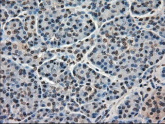 IHC-P analysis of human pancreas tissue using GTX84507 Mig-2 antibody [9E4].
