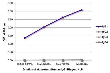 Mouse Anti-Human IgG1 (hinge region) antibody [4E3] Cat. No. GTX04178 Cat. No. GTX04178 GTX04178 ELISA Image ELISA analysis of purified human immunoglobulins using serially diluted GTX04178 Mouse Anti-Human IgG1 (hinge region) antibody [4E3] followed by GTX35185 Goat Anti-Mouse IgG1 antibody, pre-adsorbed (HRP). See all Human IgG products
