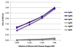 ELISA plate was coated with purified human IgG kappa, IgM kappa, IgA kappa, IgG lamda, IgM lamda, and IgA lamda. Immunoglobulins were detected with serially diluted Mouse Anti-Human (kappa chain) secondary antibody, clone SB81a (HRP). - Gene Info — IGKC