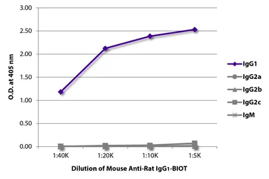 ELISA analysis of purified rat immunoglobulins using serially diluted GTX04139-02 Mouse Anti-Rat IgG1 antibody [G11C5] (Biotin) followed byStreptavidin (HRP).