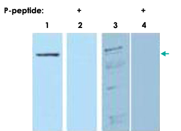 Western blot analysis of recombinant protein with PDCD4 (phospho S457) polyclonal antibody (Cat # PAB19940). Lane 1& 2 each contain 100 ng recombinant PDCD4. Lanes 3& 4 each contain 30 ug of whole cell extract from 293 HEK cells treated with 20 nM TPA and MG132 proteosome inhibitor for 8 hours. The signal can be competed off with peptide phosphorylated at Ser 457 (Lanes 2 & 4) - Gene Info — PDCD4