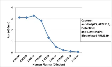 Sandwich ELISA analysis of human plasma using GTX60864 Human IgG3 antibody [RM119] as the capture antibody (100ng/well) and GTX60920 Human Ig Light Chains antibody [RM129] (Biotin) as the detection antibody.