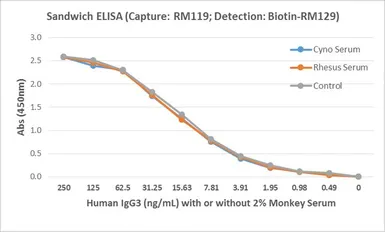 Sandwich ELISA analysis of human IgG3 in monkey serum using GTX60864 Human IgG3 antibody [RM119] as the capture antibody and GTX60920 Human Ig Light Chains antibody [RM129] (Biotin) as the detection antibody.