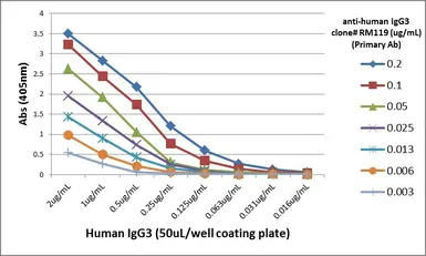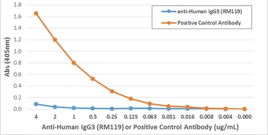 ELISA analysis of human IgG3 using GTX60864 Human IgG3 antibody [RM119]. No cross reactivity to IgM, IgA, IgD, IgE, mouse IgG, rat IgG, or goat IgG.