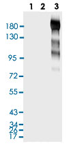 Western blot analysis of Lane 1: N (SARS-CoV-2) Recombinant Protein (Cat # P6660), Lane 2: S1 (SARS-CoV-2) RBD Recombinant Protein (Cat # P6661), Lane 3: S (SARS-CoV-2) ECD Recombinant Protein (Cat # P6662) with SARS-CoV-2 S polyclonal antibody (1:500) and Goat Anti-Rabbit IgG (H&L) secondary antibody (HRP) (1:20000).