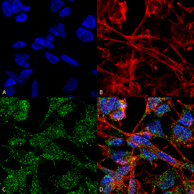 Immunocytochemical staining of SK-N-BE with Slc12a5 monoclonal antibody, clone S1-12 (APC) (Cat # MAB16982). (A) DAPI (blue) nuclear stain (B) Phalloidin Texas Red F-Actin stain (C) Slc12a5 Antibody and (D) Composite.Immunoprecipitation