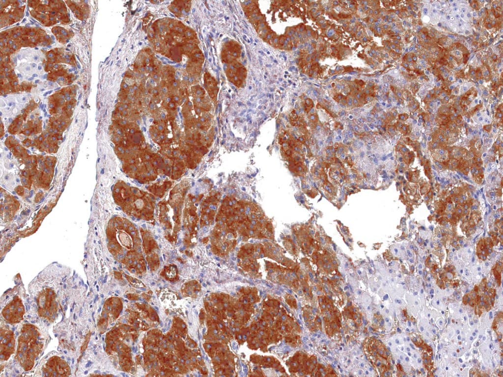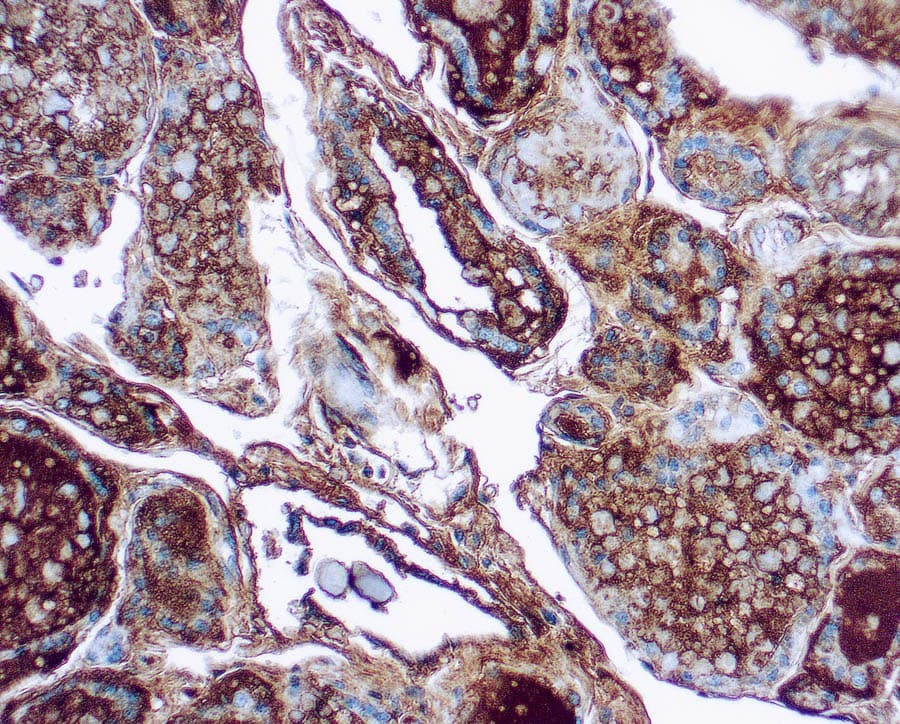 Quase todos os carcinomas foliculares da tiróide mancham a tiroglobulina e por vezes produzem um padrão de coloração focal. Pelo contrário, os carcinomas mal diferenciados e os adenocarcinomas não-tiróides não coram para a tiroglobulina, pelo que o anticorpo da tiroglobulina é um instrumento de diagnóstico útil para o reconhecimento de carcinomas papilares e foliculares da tiróide. Um painel de Anti-Tiroglobulina e Anti-Calcitonina é útil para identificar carcinomas medulares da tiróide, enquanto que um painel de Anti-Tiroglobulina e Anti-TTF1 é útil para distinguir entre as neoplasias primárias da tiróide e as neoplasias pulmonares.