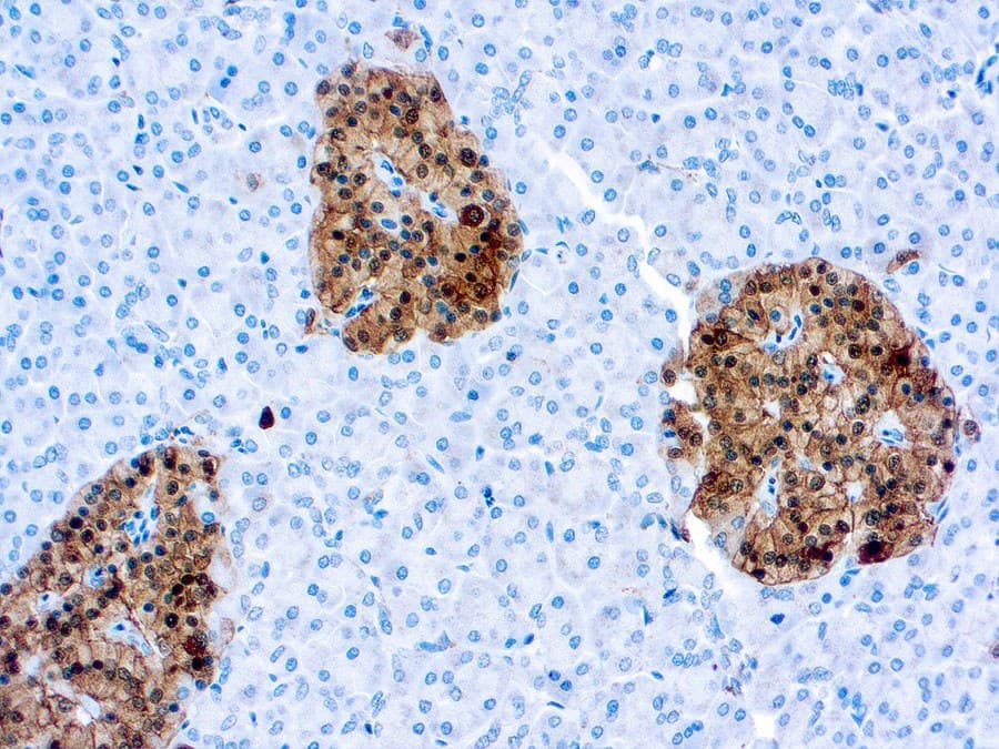 Neuron-Specific Enolase (NSE), also known as Enolase 2 (ENO2), is one of three enolase enzymes found in mammals, and acts as a phosphopyruvate hydratase. NSE is an enzyme that catalyzes the conversion of 2-phosphoglycerate to phosphoenolpyruvate in the glycolytic pathway, and the reverse reaction in gluconeogenesis. NSE has a high stability in biological fluids and can easily diffuse to the extracellular medium and cerebrospinal fluid (CSF) when neuronal membranes are injured.This mammalian glycolytic isoenzyme is located specifically in neurons of neuroendocrine cells, as well as tumors associated with those neurons; however, it has also been detected immunohistochemically in non-neoplastic cells of the pituitary, peptide-secreting tissues, pinealocytes, neuroendocrine cells of the lung, thyroid, parafollicular cells, adrenal medulla, islets of Langerhans, Merkel cells of the skin, and melanocytes. NSE is also a useful marker for identifying normal striated muscle, hepatocytes, and peripheral nerves. Anti-NSE may detect for neuroendocrine differentiation, only when used in a panel of antibodies including more specific markers such as synaptophysin, chromogranin, and neurofilament.
