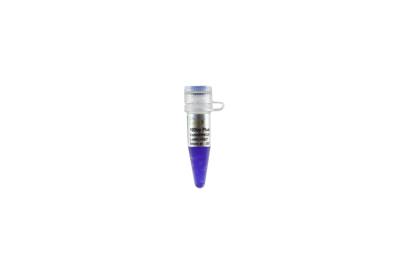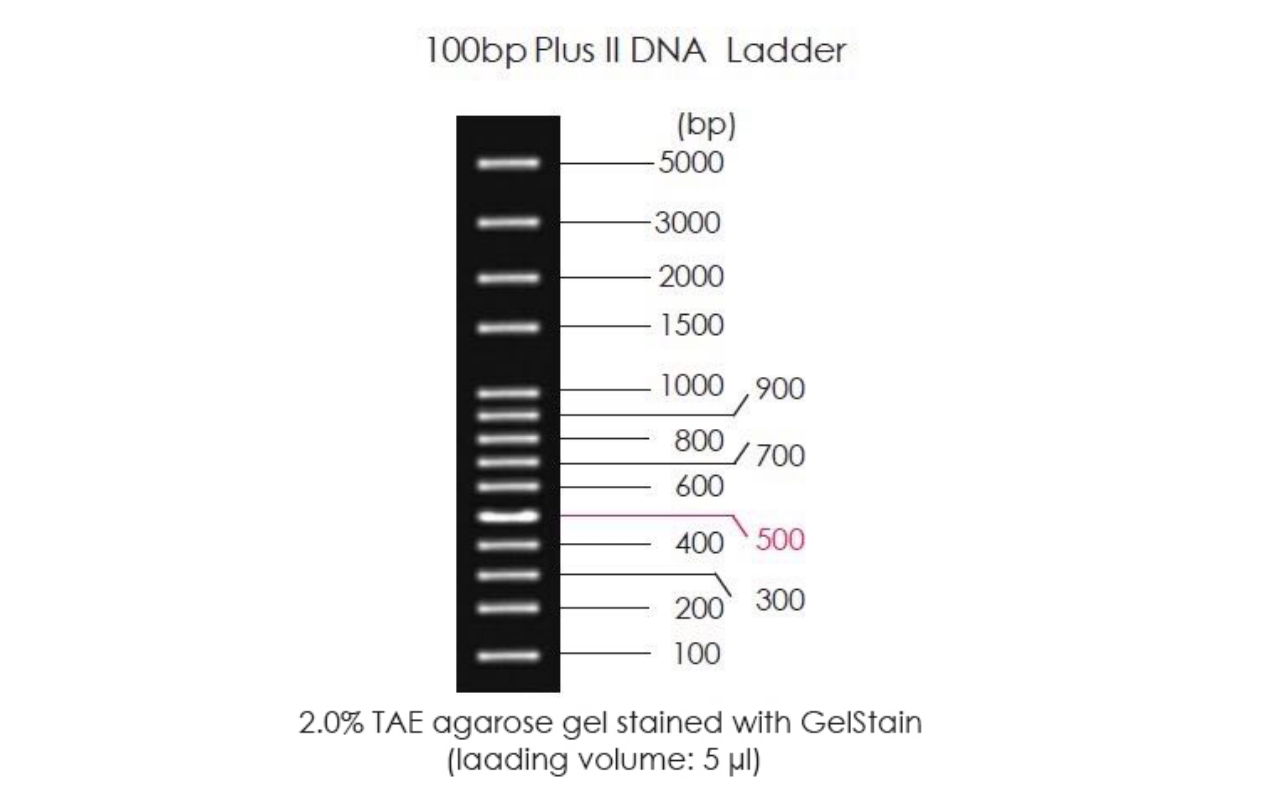 100bp Plus II DNA Ladder is a premixed, ready-to-load molecular weight marker containing eight linear double-stranded DNA fragments. The DNA Ladder is suitable for use as molecular weight standards for agarose gel electrophoresis. The DNA Ladder contains 100bp -5.0 kb DNA fragments. The 500bp band (100 ng/5 μl) has doubled intensity than other bands to serve as reference 100bp-1500bp.