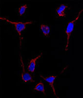 Immunofluorescence analysis of ALDH1A1 polyclonal antibody (Cat # PAB3123) in HeLa cells. Primary antibody was followed by Alexa-Fluor-546-conjugated donkey anti-rabbit lgG (H+L). Alexa-Fluor-546 emits orange fluorescence. Blue counterstaining is DAPI.Flow Cytometry