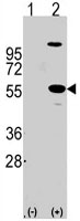 Western blot analysis of ALDH1A1 (arrow) using rabbit ALDH1A1 polyclonal antibody (Cat # PAB3123). 293 cell lysates (2 ug/lane) either nontransfected (Lane 1) or transiently transfected with the ALDH1A1 gene (Lane 2) (Origene Technologies). - Gene Info — ALDH1A1