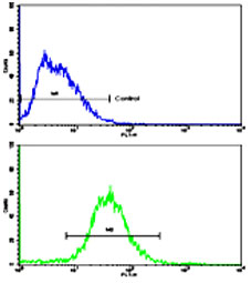 Flow cytometric analysis of HepG2 cells using ALDH1A1 polyclonal antibody (Cat # PAB3123)(bottom histogram) compared to a negative control cell (top histogram).