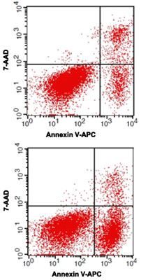 Lower: Camptothecin treated Jurkat cell stained with Annexin V-APC + 7-AAD