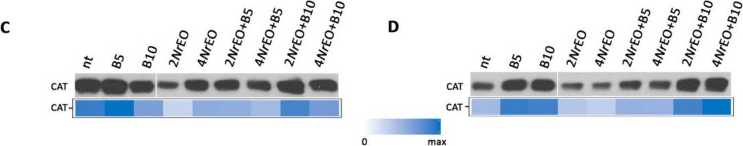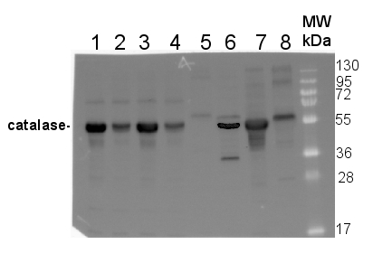 | 10 µg of total protein from Arabidopsis thaliana Col0 (1), Cat2-(Col0) (2), Ler0 (3), Cat2-(Ler0) (4), Zea mays (5), Oryza sativa (6), Brassica oleracea (7), Nicotiana bentamina (8) were extracted with 60mM Tris pH 6.9, 10mM DTT, 20% glycerol, 1mm PMSF were separated on 12.5% SDS-PAGE and blotted 1h to PVDF. Blot was blocked with 3% skim milk in PBS+0.05% Tween20 for 1h at room temperature (RT) with agitation. Blot was incubated in the primary antibody at a dilution of 1: 1 000 for 1h at RT with agitation in the same buffer. The antibody solution was decanted and the blot was rinsed briefly three times, then washed 3 times for 5 min in PBS-T at RT with agitation. Blot was incubated in secondary antibody (anti-rabbit IgG horse radish peroxidase conjugated, Agrisera, AS09 602) diluted to 1:50 000 in 3% skim milk in PBS+0.05% Tween20 for 1h at RT with agitation. The blot was washed as above and developed for 1 min with Western Lightning Plus-ECL ( PerkinElmer )according to the manufacturers instructions. Exposure time was 5min. in ChemiDoc XRS+ (Biorad ). Blots were performed from 10 µg of protein from total extracts, crude extracts as well as from isolated tagged-mitochondria (leaves or roots). Arabidopsis thaliana protein extracts were prepared using a protein extraction buffer (100 mM Tris-HCl pH 7.5, 50 mM EDTA, 250 mM NaCl, 0.05% SDS). Samples were denatured with Laemmli buffer (Bio-Rad) supplemented with 10% β-mercaptoethanol at 95°C for 10 min before separating the protein mixtures on reducing 12% polyacrylamide gel. Protein extracts were blotted 1h onto a 0.45 µm nitrocellulose membrane using wet transfer. Blots were blocked with 5% milk for 1h/RT with agitation. Blots were incubated with the primary antibodies anti-catalase (Agrisera, AS09 501) at a dilution of 1: 1 000 for ON/4°C with agitation in TBS-T or PBS-T + 2% milk, respectively. Blots were washed 3 times for 5 min in TBS-T or PBS-T at RT with agitation. Blot was incubated for 1h/RT with agitation in Agrisera matching secondary antibodies (anti-rabbit IgG horse radish peroxidase conjugated, AS09 602) diluted to 1:10 000 in TBS-T or PBS-T + 2% milk. Blots were washed 3 times for 5 min in TBS-T or PBS-T following by 3 additional washing steps for 5 min in TBS or PBS. Visualization was carried out using the chemiluminescence kit Agrisera ECLBright; AS16 ECL-N-100 and signals were detected using Azure c600 Western Blot Imaging system (Azure biosystems). Exposure time was 2-5 min. | |