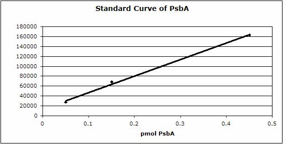 Example | Undergraduate students performed a light shift experiment on two cyanobacterial strains, Synechococcus elongatus PCC 7942 and Anabaena sp. PCC 7120. The students prepared 4 samples for each species and loaded 0.1 ug chlorophyll per lane. Standard lanes of PsbA (D1) protein contained 0.05 pmoles , 0.15 pmoles and 0.45 pmoles. The blots were processed as described above with the chicken anti-PsbA antibody used at 1:20,000 and rabbit anti-chicken IgY-HRP secondary antibodies at 1:50,000. The resulting blot is shown in Figure 1.