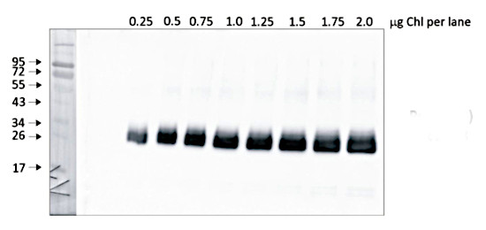 | Additional information (application): | There is a confirmed cross-reaction with TLA1 protein in Chlamydomonas reinhardtii. For samples with a very low PSII content theremight be detection problems independent of the antibody. PSII proteins can vary in level depending upon liquid culture conditions. When the cells are in a stationary phase PSII content can drop to a very low level. |
