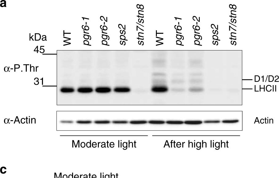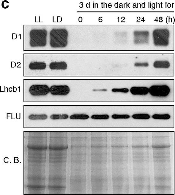 | Application examples: | Reactant: Plant Application: Western Blotting Pudmed ID: 27590049 Journal: BMC Plant Biol Figure Number: 9A Published Date: 2016-09-02 First Author: Mazur, R., Sadowska, M., et al. Impact Factor: 4.142 Open PublicationChanges of PSII and PSI antenna and core protein levels. Proteins from control and Tl-treated white mustard leaves were separated by SDS-PAGE followed by immunodetection with antibodies against Lhcb1, Lhcb2, Lhca1 (antenna proteins) and D1, D2, CP43, PsbO, PsaA (core proteins). Samples were loaded on the equal amount of chlorophyll (0.25 ?g). Description of samples abbreviation as given in the legend to Fig. 3 Reactant: Chlamydomonas reinhardtii (Green Alga) Application: Western Blotting Pudmed ID: 28466860 Journal: Nat Commun Figure Number: 5A Published Date: 2017-05-03 First Author: Fu, H. Y., Picot, D., et al. Impact Factor: 13.783 Open PublicationAccumulation of photosynthetic complexes in the mutant strains.Cells were grown in TAP medium at 25?°C under LED white light (8??mol photons m?2?s?1) and collected at the mid-log phase. Two independent lines are shown for each construct. Protein samples were loaded on an equal chlorophyll basis (0.5??g per lane), and a dilution series of WT samples is shown for semi-quantitative comparison. Antibodies against essential subunits of PSII (D2), PSI (PsaA), cytochrome b6f (PetA) and ATP synthase (AtpB) probed the accumulation of the respective photosynthetic complexes. Numbers on the left side of the blots are molecular weights in kD. See Supplementary Fig. 9 for the uncropped blot images. Reactant: Arabidopsis thaliana (Thale cress) Application: Western Blotting Pudmed ID: 31240258 Journal: Commun Biol Figure Number: 2A Published Date: 2019-06-27 First Author: Pralon, T., Shanmugabalaji, V., et al. Impact Factor: None Open PublicationThylakoid protein phosphorylation and state transitions are disturbed after high light treatment in pgr6 background. a Total protein extracts of 4-week-old wild type (WT), pgr6-1, pgr6?2, sps2 and stn7/stn8 analysed by immunoblotting with anti-phosphothreonine antibody; the principal thylakoid phospho proteins are indicated on the right according to their size. Core photosystem II proteins D1 (PsbA) and D2 (PsbD) are indicated as a single band due to their poor resolution. Actin was used as a loading control. b Lhcb1 and Lhcb2 phosphorylation levels were visualised after separation on Phostag™-pendant acrylamide gels. The upper band corresponds to the phosphorylated form (p-), stn7/stn8 double mutant is a non-phosphorylated control. c Average transient of the variable room temperature chlorophyll fluorescence measured during the transition from red (660nm) supplemented with far-red light (720nm) state 1 to pure red light state 2 (n?=?4 independent pots containing 2–3 plants). The fluorescence curves from pgr6 and sps2 are shifted on the x-axis to allow visualising the FMST1 and FMST2 values. The x-axis time scale refers to the wild-type curve. d Calculated quenching related to state transition (qT?=?(FMST1?–?FMST2)/FM), expressed as the percentage of FM that is dissipated by the state 1 to state 2 transition, of wild type (WT), pgr6?1 and sps2 under moderate light (120?mol?m?2?s?1) (ML) and after 3?h of high light (500?mol?m?2?s?1) (HL). Whiskers and box plot shows the minimum, first quartile, median, average, third quartile and maximum of each dataset (n?=?4 biologically independent samples); p-values are calculated via a two-tailed Student’s t test. e STN7 phosphorylation level visualised after separation on Phostag™-pendant acrylamide gels. The upper band corresponds to the phosphorylated form (p-), a protein sample from stn7/stn8 double mutant was loaded as a control for the antibody specificity. Uncropped images of the membranes displayed in a, b and e are available as Supplementary Fig. 11. Data points for items c, d are available as Supplementary data 2 Reactant: Arabidopsis thaliana (Thale cress) Application: Western Blotting Pudmed ID: 32963291 Journal: Sci Rep Figure Number: 3C Published Date: 2020-09-22 First Author: Wang, L., Leister, D., et al. Impact Factor: 4.13 Open PublicationPhotomorphogenesis is not significantly affected in ros1, nrpd1, nrpe1, rdr2 or ago4 mutant seedlings. (a) Phenotypes (upper panel) and the corresponding maximum quantum yields of PSII (Fv/Fm) (lower panel) of 4-day-old etiolated seedlings. Fv/Fm was measured with an imaging Chl fluorometer (Imaging PAM). Scale bar?=?1 cm. (b) Phenotypes (upper panel) and corresponding Fv/Fm values (lower panel) of 3-day-old etiolated seedlings which had been exposed to continuous light for 24 h. (c) Immunoblot analysis of the PSII core proteins (D1 and D2), Lhcb1 and FLU during greening of etiolated seedlings. WT seedlings were grown for 3 days in the dark and exposed to light for between 0 and 48 h, as indicated. Extracted total proteins were normalized with respect to fresh weight and fractionated by SDS-PAGE. Blots were then probed with antibodies raised against the individual proteins. Total proteins from 5-day-old WT seedlings grown under continuous light (LL) and LD conditions (LD) were used as positive controls. The total protein accumulation of each sample was visualized by staining the gel with Coomassie Blue R250 (C.B.). The figure was assembled from different blots (delineated by a black rectangle) and full-length blots are presented in Supplementary Fig. S7. (d) Immunoblot analysis of representative photosynthesis proteins of 3-day-old etiolated mutant seedlings which had been exposed to continuous light for 24 h. Immunoblot analysis was performed as in (c). The figure was assembled from different blots (delineated by a black rectangle) and full-length blots are presented in Supplementary Fig. S8. (e) Real-time PCR analyses of 3-day-old etiolated WT (Col-0) and mutant seedlings that had been exposed to continuous light for 24 h. Real-time PCR was performed with primers specific fo