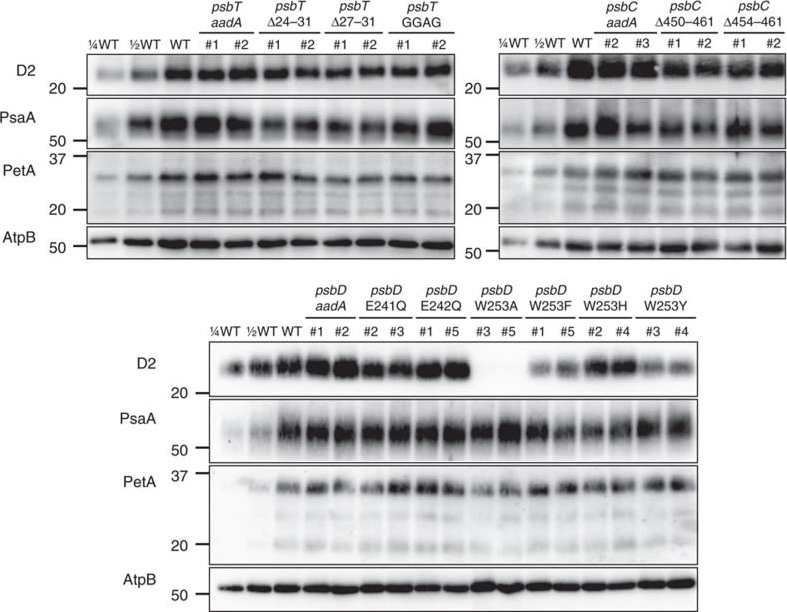 Photosystem II Anti-PsbA C-terminal (AS01 016, AS05 084) | Anti-PsbA N-terminal | (AS06 124) | standard: recombinant PsbA (AS01 016S) | Anti-PsbB (AS04 038) | Anti-PsbD (AS06 146) |