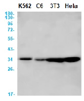 Western blot analysis of CDK4 in K562, C6, 3T3, Hela lysates using human CDK4 recombinant monoclonal antibody, clone R04-4I5 (Cat # RAB01514). - Gene Info — CDK4