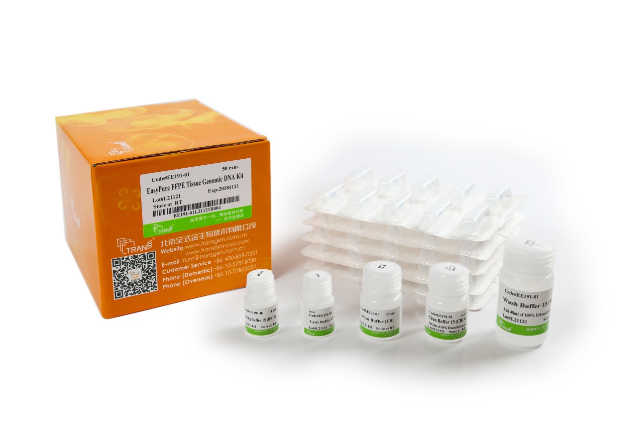 EasyPure® FFPE Tissue Genomic DNA Kit is designed for extracting genomic DNA from formalin-fixed, paraffin-embedded (FFPE) tissue blocks and sections. It uses xylene deparaffinization method to remove paraffin, followed by enzymatic tissue lysis and a specialized incubation step to effectively reverse formaldehyde-induced cross-linking. DNA is specifically adsorbed using a silica-based column. The purified DNA is suitable for downstream applications including PCR, qPCR.